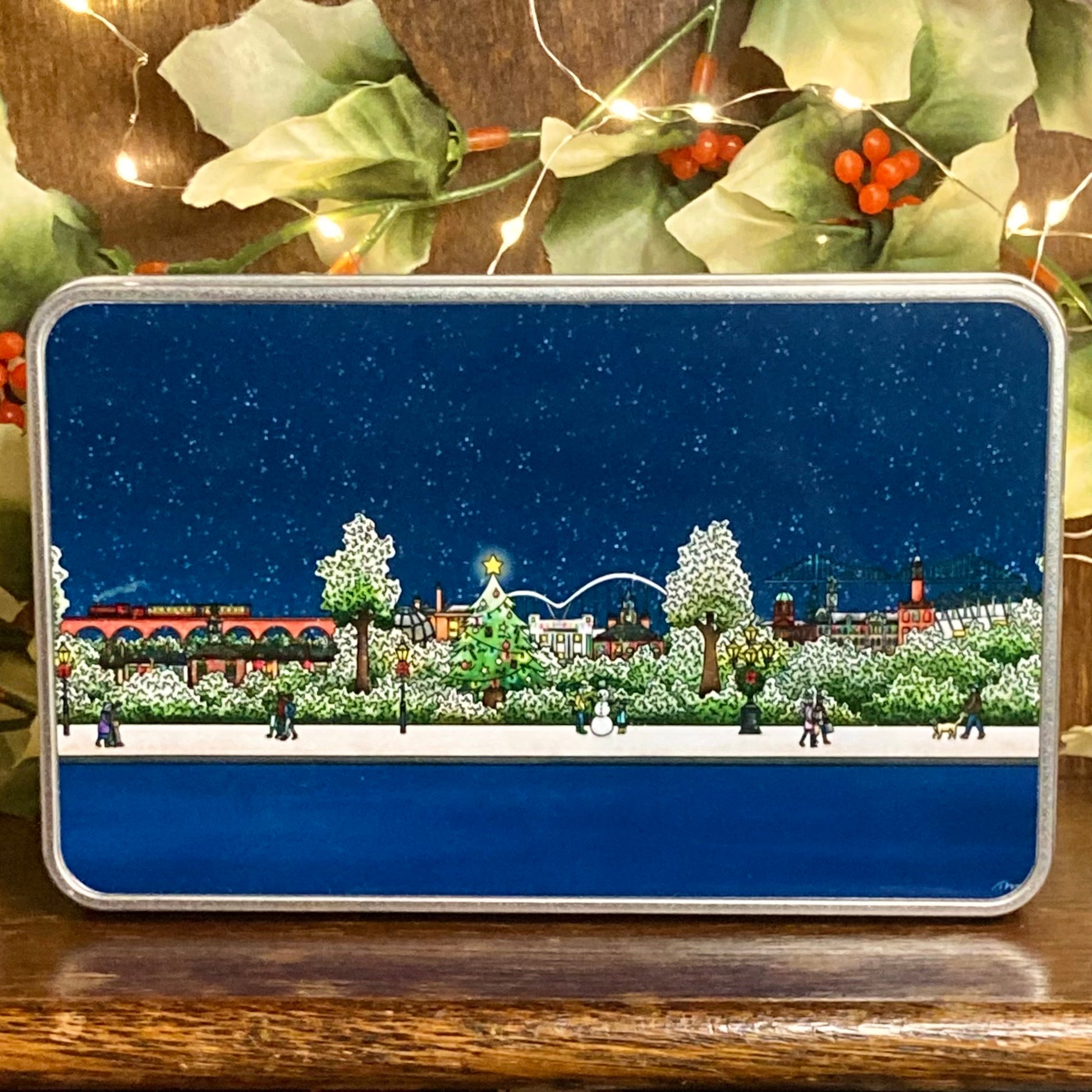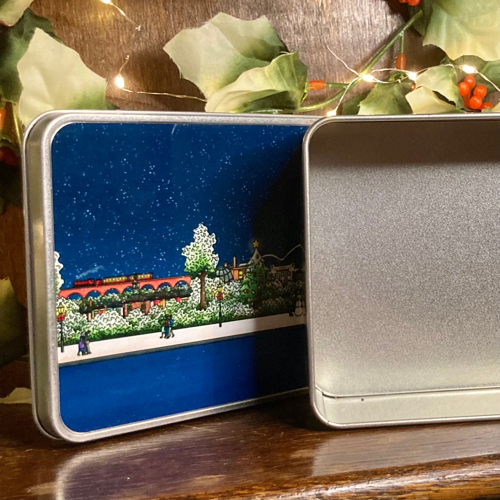 Store your trinkets in style with our Christmas on Teesside Trinket Tin. Featuring a festive scene illustrated by Tom Mankin, this tin adds a touch of holiday charm to your home decor. Keep your small items organised while bringing a touch of Teesside style into your home.