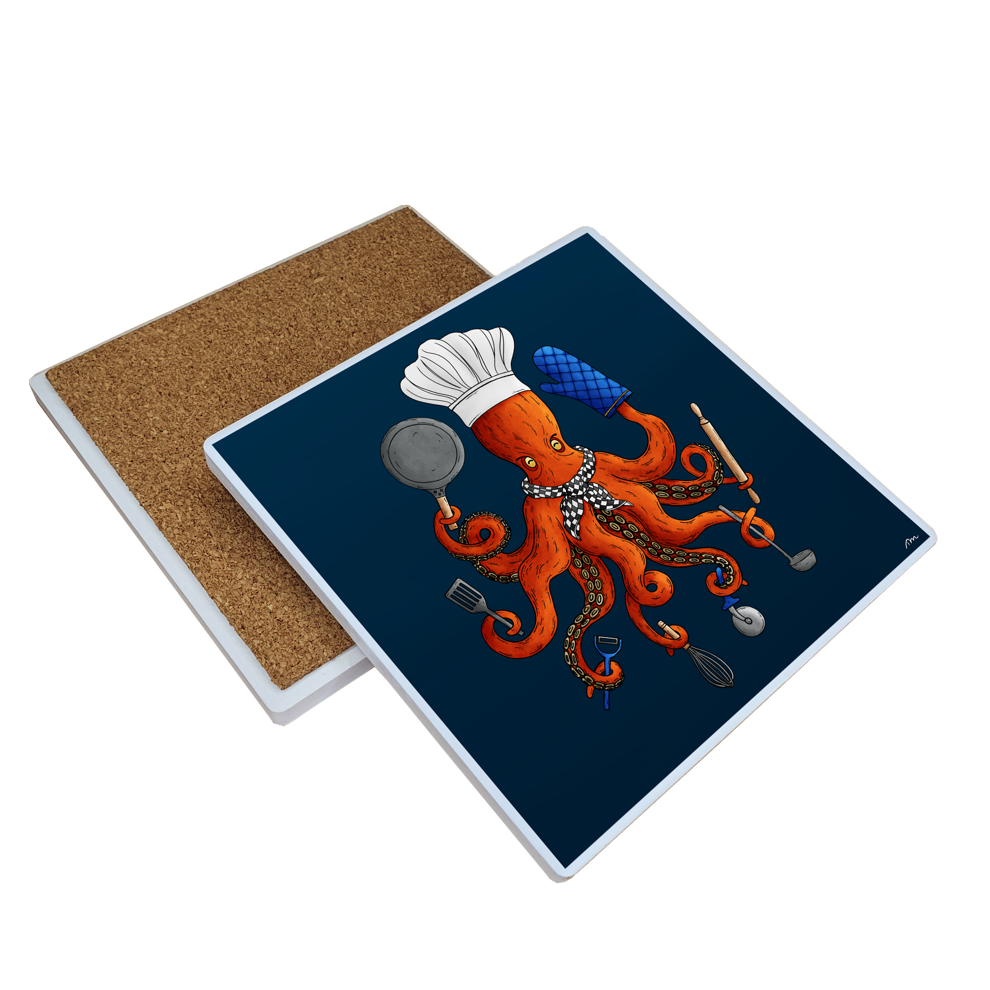 Famous throughout the seven seas for his 'Deeply Delicious' culinary creations, this octopus chef needs no help in the kitchen! You can add a pinch of deep sea flavour to your coffee table with this ceramic coaster featuring the original illustration 'Deeply Delicious' by Tom Mankin. This octopus chef drink mat is printed on heavier weight ceramic and features a sandstone finish and cork back.