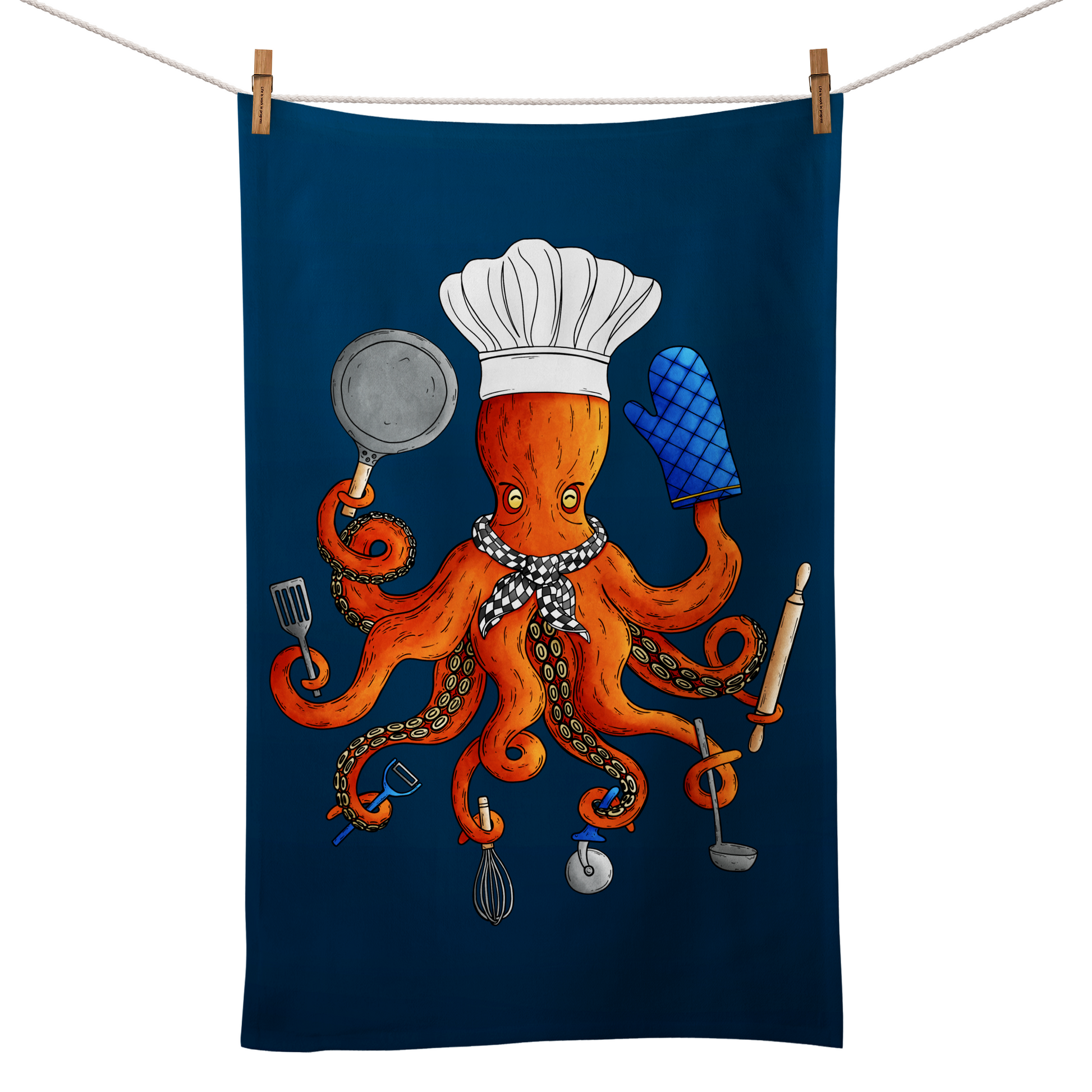 Famous throughout the seven seas for his 'Deeply Delicious' culinary creations, this octopus chef needs no help in the kitchen! You can add a pinch of deep sea flavour to the washing up with this tea towel featuring the original illustration 'Deeply Delicious' by Tom Mankin. This octopus chef tea towel has been manufactured using 100% organic cotton and has been heat set to lock in colour, ensuring minimum fading over time.