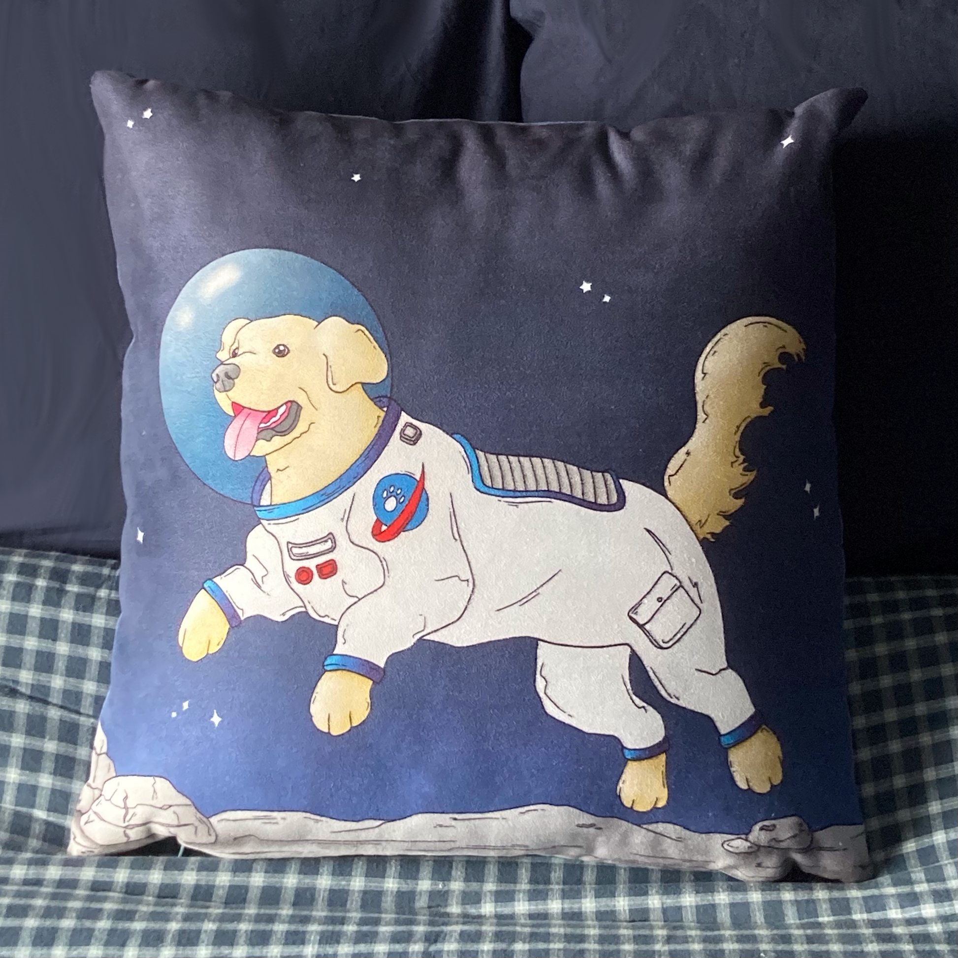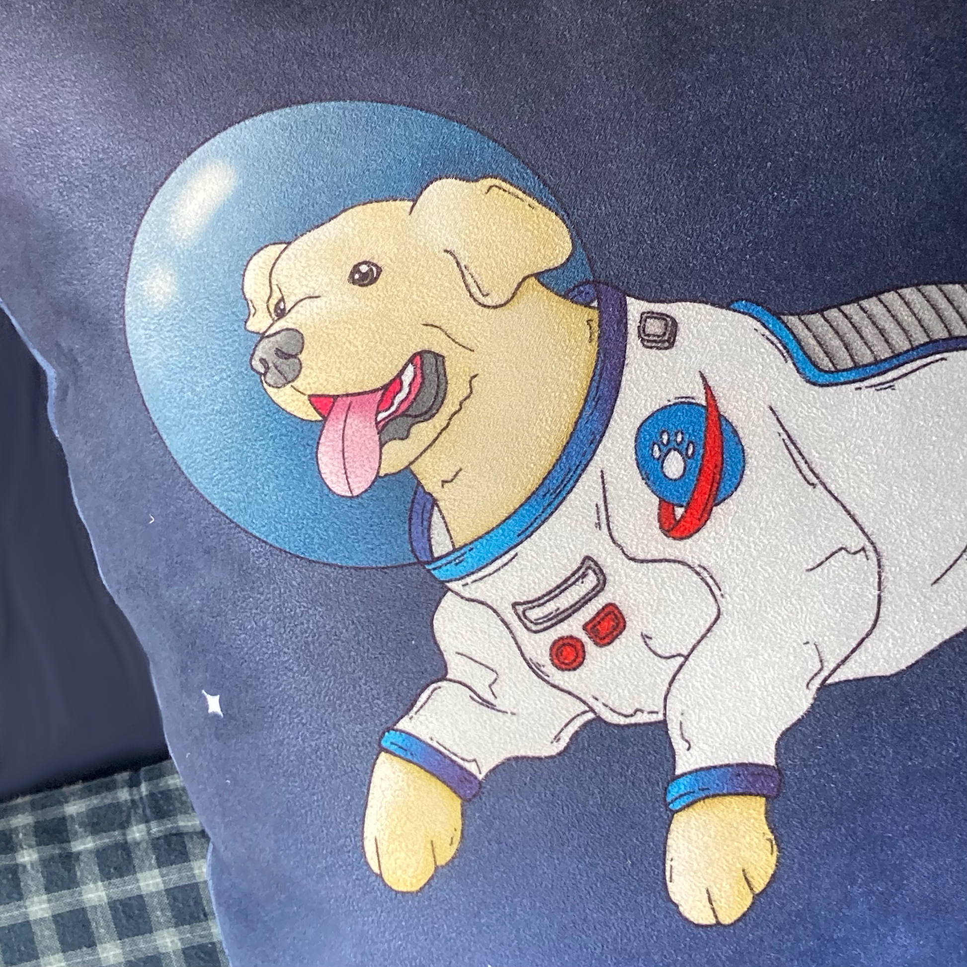 One small step for dog, one giant leap for canine kind... You can add a touch of 'out of this world' style to your sofa with this luxury cushion featuring the original illustration 'Moon Walkies' by Tom Mankin. This astronaut dog cushion features a cornflower blue back panel and has been manufactured from plush faux suede.