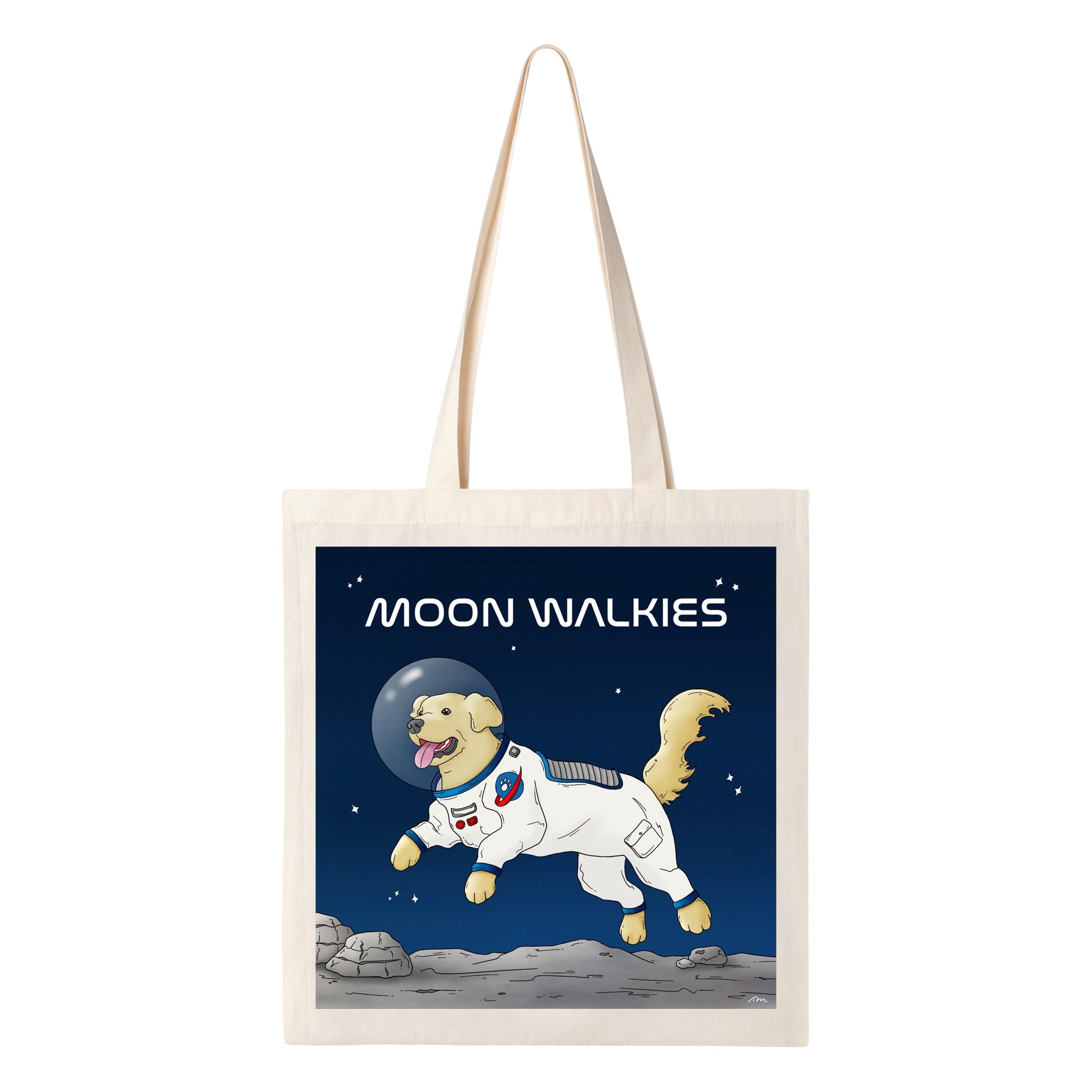 One small step for dog, one giant leap for canine kind... Keep your essentials close at hand in style with this tote bag featuring the original illustration 'Moon Walkies' by Tom Mankin. An ideal gift for dog lovers, this astronaut dog bag is manufactured using soft, eco-friendly material and is machine washable.