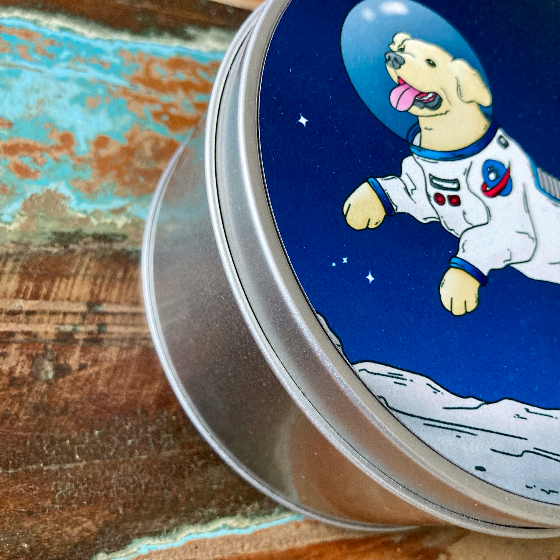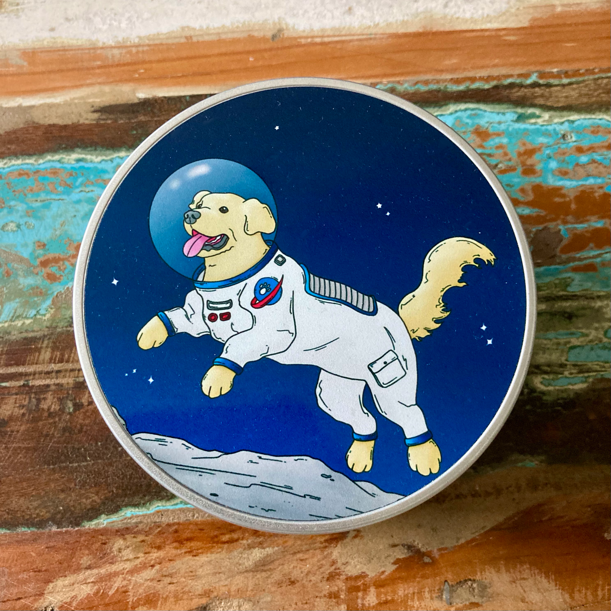 Keep all of your trinkets safe and sound in this round astronaut dog tin. This trinket tin features a Golden Retriever boldly walking on the moon and would make an ideal gift for dog lovers.