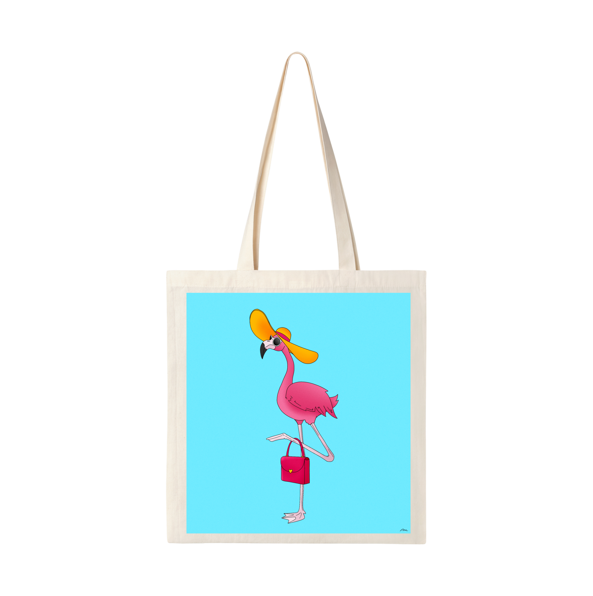 Ms Flo Mingo is a sassy bird with a large real estate portfolio. She's kind of a big deal... Keep your essentials close at hand in style with this tote bag featuring the original illustration 'Ms Flo Mingo' by Tom Mankin. An ideal gift for yourself or others, this flamingo bag is manufactured using soft, eco-friendly material and is machine washable.