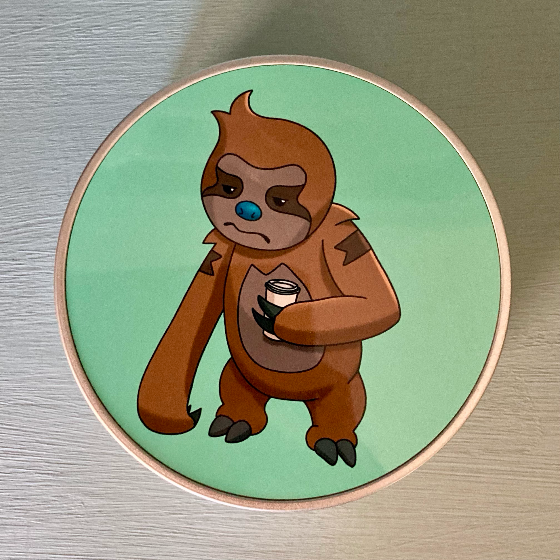 Keep your trinkets, bits and bobs safely stored away in this round tin featuring the original illustration Simon the Sloth by Tom Mankin.