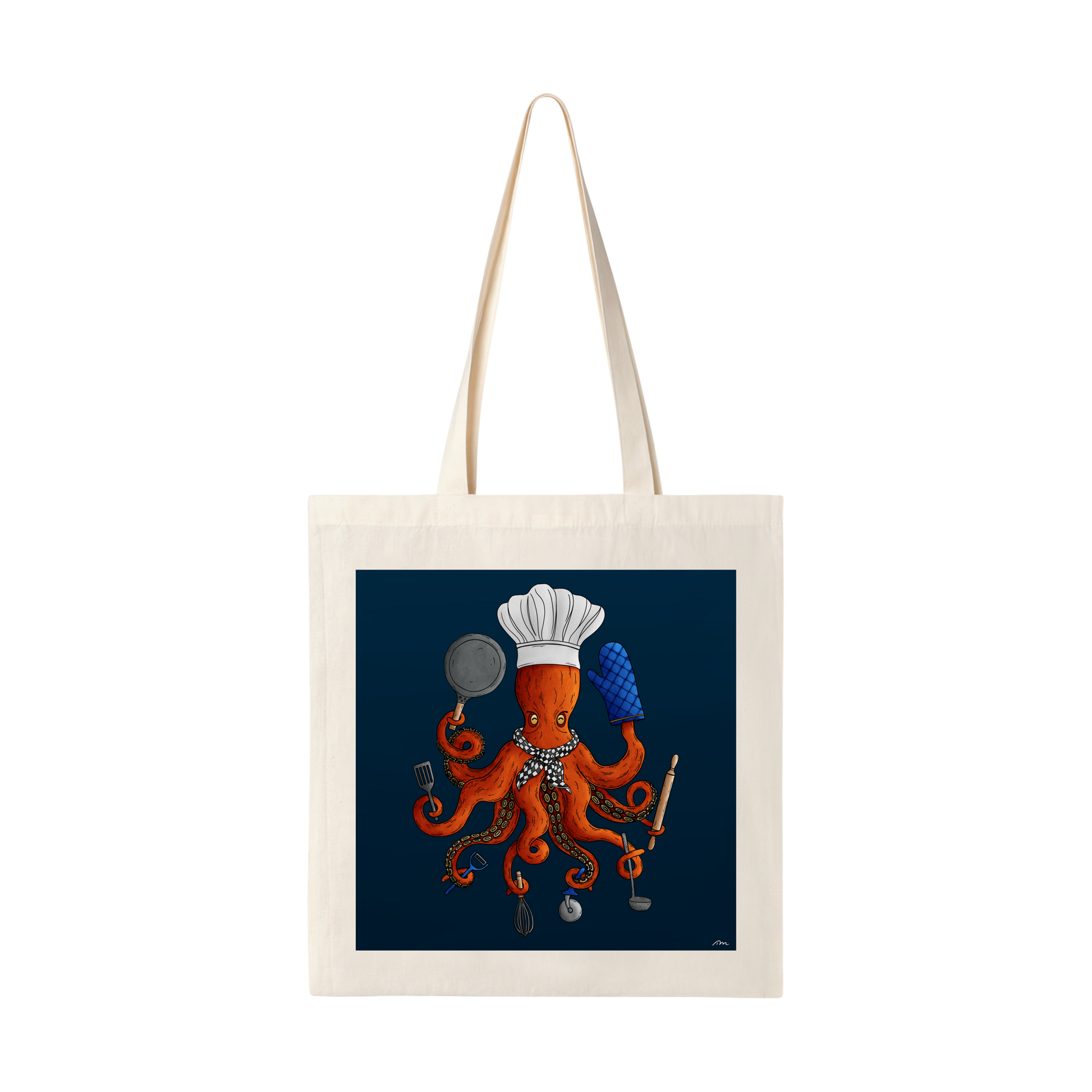 Famous throughout the seven seas for his 'Deeply Delicious' culinary creations, this octopus chef needs no help in the kitchen! Keep all of your essentials close at hand with a pinch of deep sea style thanks to this tote bag featuring the original illustration ‘Deeply Delicious’ by Tom Mankin.