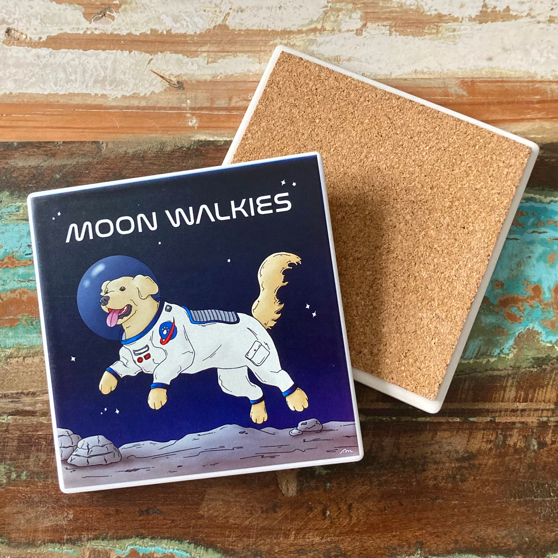 One small step for dog, one giant leap for canine kind... Add some 'out of this world' style to your coffee table with an astronaut dog coaster featuring the original illustration ‘Moon Walkies’ by Tom Mankin. Each of these Golden Retriever coasters is printed in the U.K. on high quality sandstone finish ceramic.
